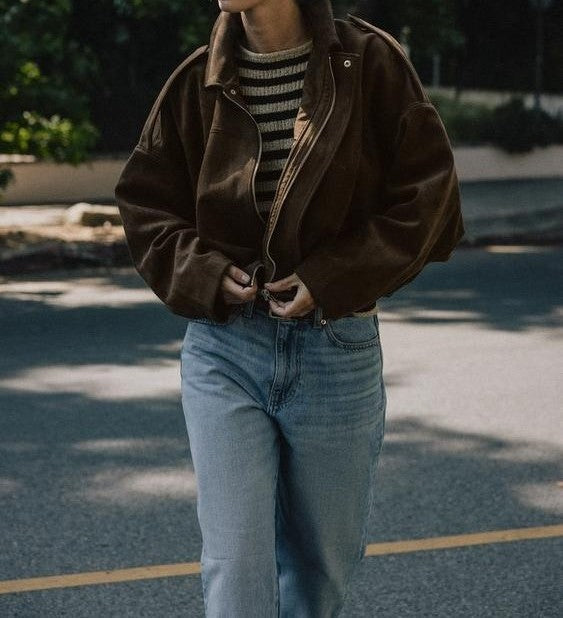 Elegante suède jack met reverskraag en lange mouwen met een bandje op de schouder. De zoom is afgewerkt met plooien en is wijdvallend. Sluiting aan de voorkant met knopen die zijn verborgen achter een overslag.